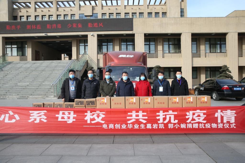 1月12日下午,我校经济与贸易学院毕业生葛岩凯和郭小婉为学校捐赠1800箱奶油南瓜、2万只口罩、100桶消毒液等物资,助力学校疫情防控工作。党委副书记、纪委书记王勇胜代表学校接受捐赠。
