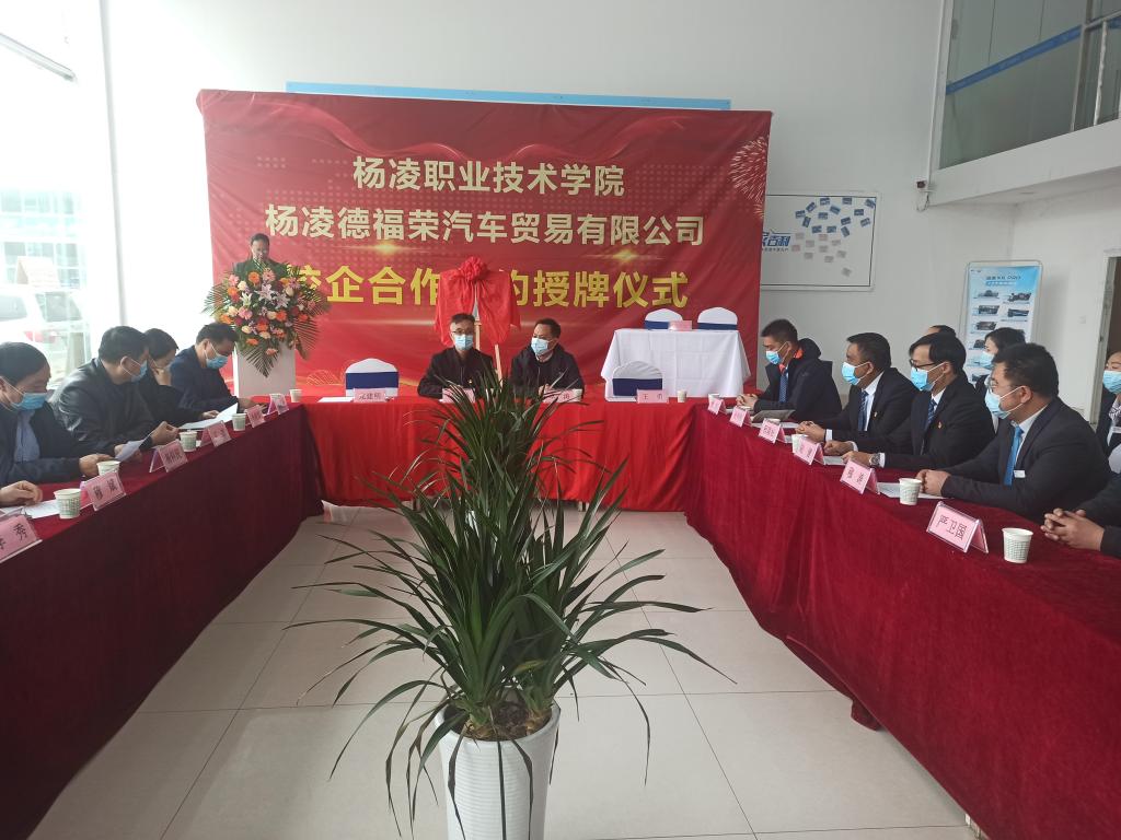 3月30日上午,我校机电工程学院与杨凌德福荣汽车贸易有限公司举行校企合作签约暨校外实训基地揭牌仪式。杨凌示范区工商联党组书记卓涛,杨陵区委常委、组织部部长王勇,杨陵区工商联党组书记李俊苗、工信局局长陈团江及李台街道党工委相关领导,我校机电工程学院党总支书记马秀魁、院长龙建明,杨凌德福荣汽车贸易有限公司法人穆斌、总经理穆涛等出席签约仪式。