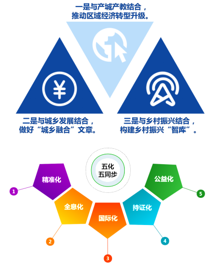 “党建引领‘三进五化’育训赋能乡村振兴”育训模式即:以“党建+”为引领,通过“校政融通、校企联通、校校贯通”三通机制促进继续教育三全育人,以“培训+”为抓手,持续推进培训“进乡村、进行业、进国际”,落实培训“与产城产教结合、与行业企业结合、与乡村振兴结合”,通过“三进三结合”,推动培训“精准化、全息化、国际化、公益化、持证化”的五化培训体系,助推“产业振兴、人才振兴、文化振兴、生态振兴、组织振兴”五大振兴同步发展。