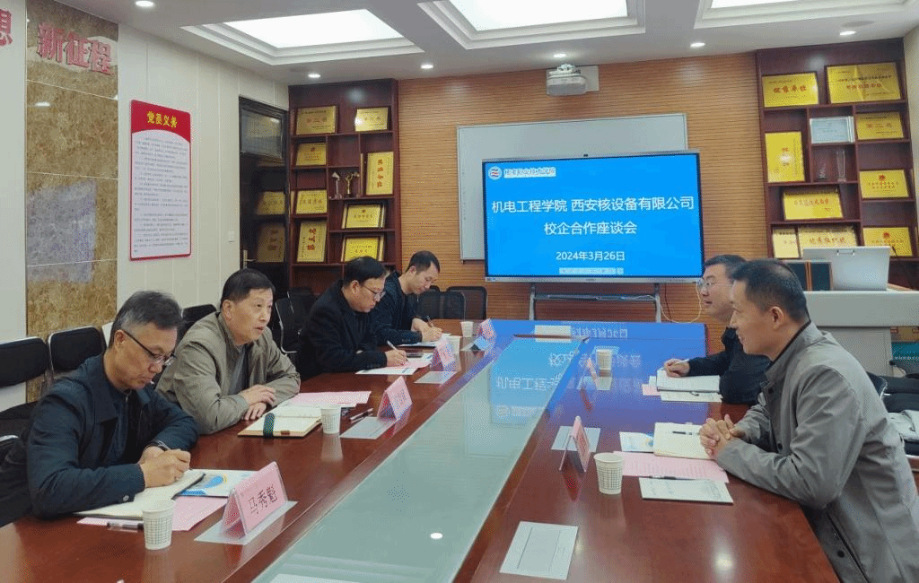 3月26日上午,西安核设备有限公司党委副书记、纪委书记刘昌辉、人力资源部副主任党博一行来校洽谈校企合作。副校长祝战斌,招生就业处、机电工程学院负责人参加座谈。