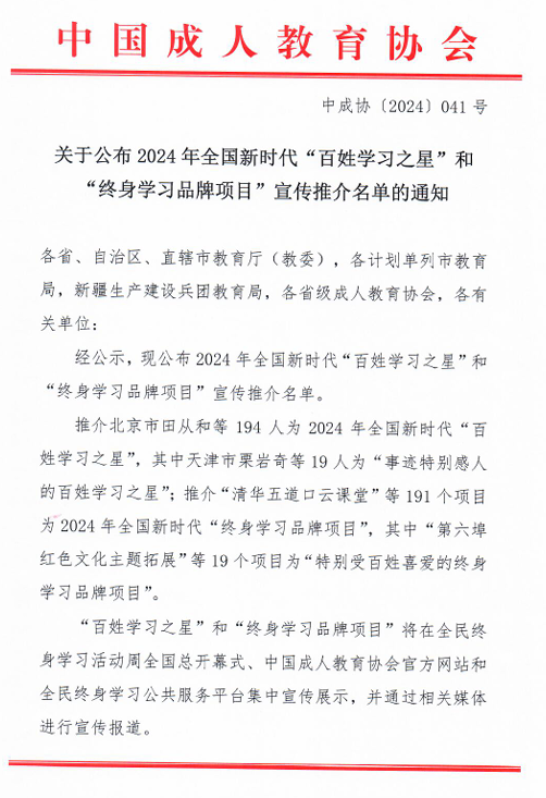 近日,中国成人教育协会和省教育厅公布了2024年全国和全省新时代“终身学习品牌项目”推介名单,我校继续教育与培训学院《“农民吹哨 专家报到”终身教育促振兴》项目成功入选全国和全省新时代“终身学习品牌项目”。这是学校第二次获得全国新时代“终身学习品牌项目”,也是连续四年获得省级新时代“终身学习品牌项目”。