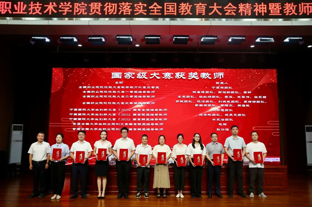 颁奖仪式上,韩明军为光荣从教30年教师颁发荣誉证书和纪念章,为获国家级成果教师颁发荣誉证书。刘瑞明为获省级荣誉、成果教师颁发荣誉证书。王勇胜为国家级大赛获奖教师代表颁发荣誉证书。祝战斌为省级大赛一等奖获奖教师代表颁发荣誉证书。胡俊鹏为省级课程建设获奖教师代表颁发荣誉证书。
