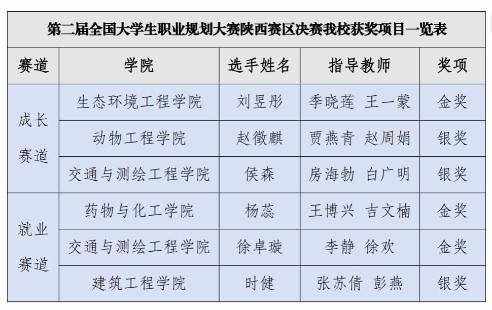 本次大赛以“筑梦青春志在四方,规划启航职引未来”为主题。经过激烈角逐,我校生态环境工程学院学生刘昱彤获职教组成长赛道金奖,动物工程学院学生赵徵麒、交通与测绘工程学院学生侯森获职教组成长赛道银奖;药物与化工学院学生杨蕊、交通与测绘工程学院学生徐卓璇获职教组就业赛道金奖,建筑工程学院学生时健获职教组就业赛道银奖。