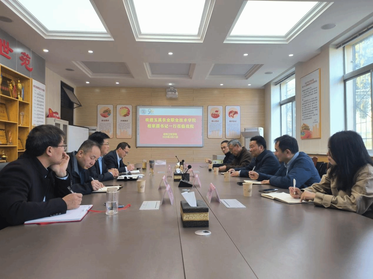 3月21日下午,玉溪农业职业技术学院党委书记柏家渭、副院长张军云一行来校考察交流。玉溪市教育体育局人事科副科长姜荣恒,玉溪农业职业技术学院银龄教师、陕西省畜牧业协会宠物产业分会会长周庆国,玉溪农业职业技术学院人事科科长何晓颖共同考察。我校动物工程学院负责人和教师代表等陪同考察。