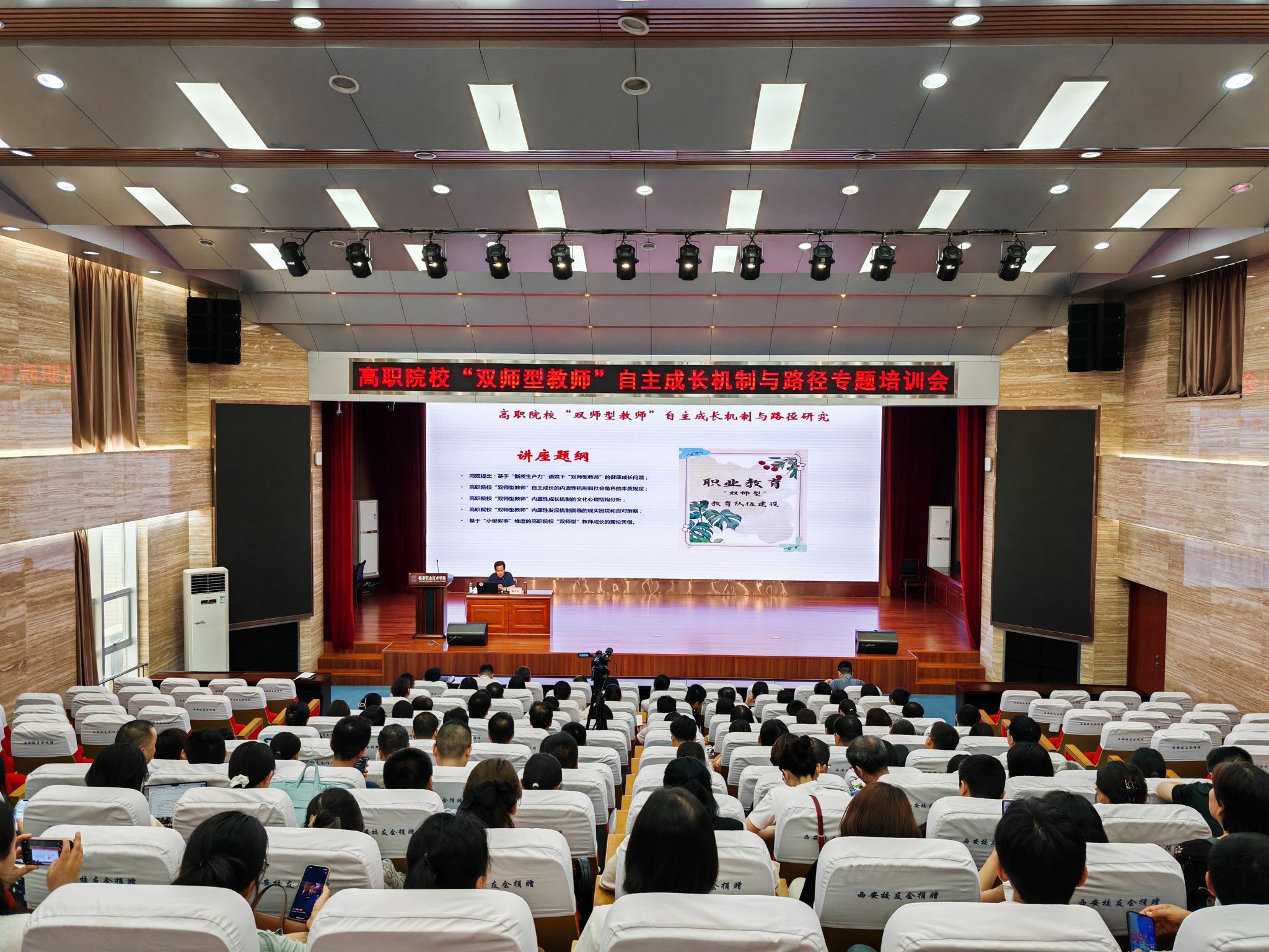 6月20日下午,学校举办高职院校“双师型”教师自主成长机制与路径专题培训会。本次培训特邀长安大学马克思主义学院教授、当代陕西研究会副会长戴生岐主讲,职业本科授课教师及马克思主义学院全体教师共130余人参加培训。