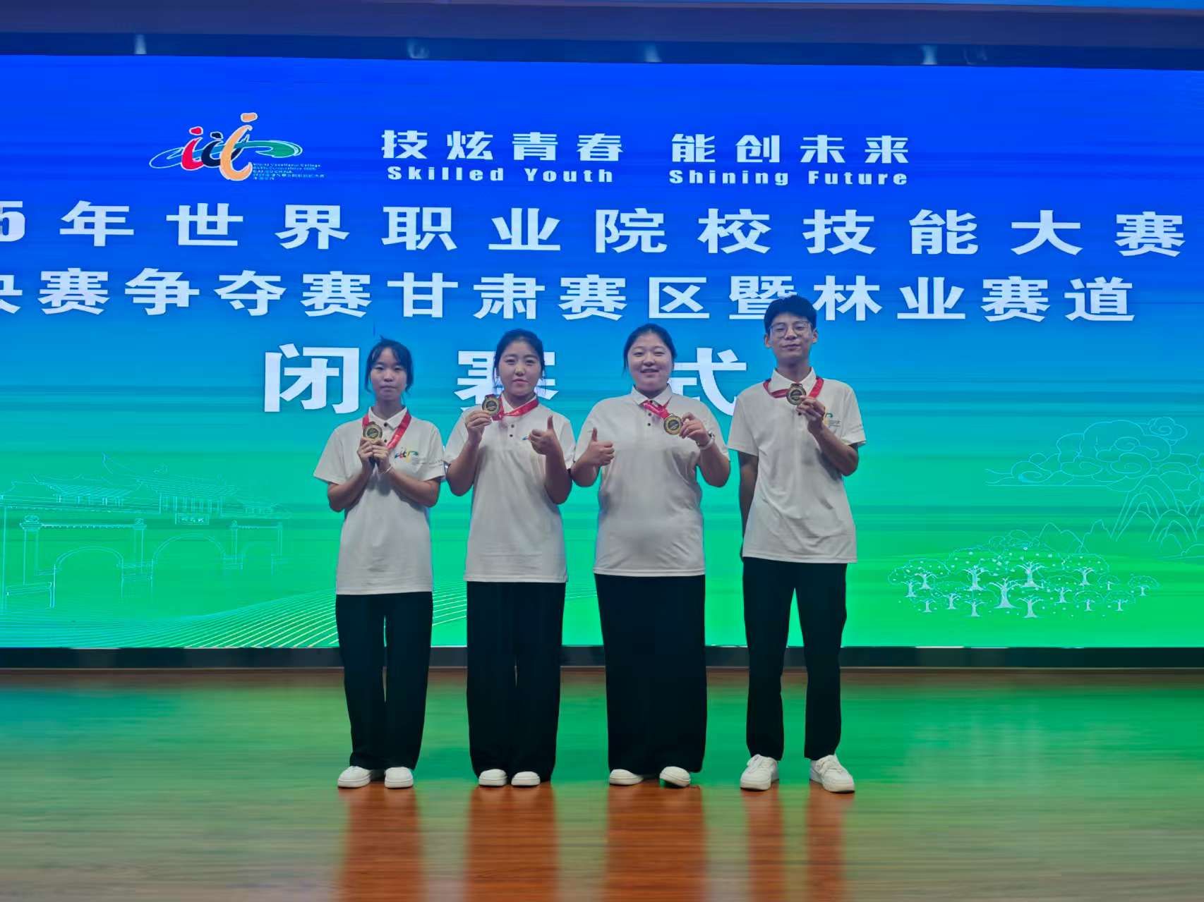 8 月 26 日至 30 日,2025 年世界职业院校技能大赛总决赛争夺赛高职组林业赛道比赛在甘肃天水成功举办。本次赛事以“技炫青春 能创未来”为主题,吸引了来自全国 75 所高职院校的 340 名选手同台竞技。由学校生态环境工程学院张永丽、王一蒙老师指导,南赐燚、张宇杰、李一凡和许天蕊同学组成的代表队,凭借出色的花艺作品创作表现与扎实的专业技能,勇夺金奖,位列小组第一名。