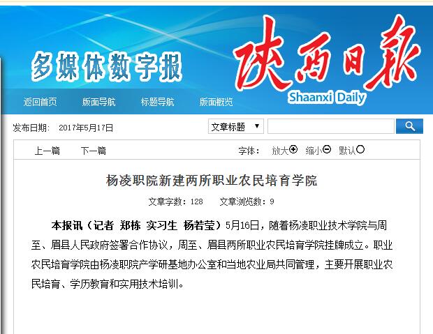 本报讯(记者 郑栋 实习生 杨若莹)5月16日,随着杨凌职业技术学院与周至、眉县人民政府签署合作协议,周至、眉县两所职业农民培育学院挂牌成立。职业农民培育学院由杨凌职院产学研基地办公室和当地农业局共同管理,主要开展职业农民培育、学历教育和实用技术培训。