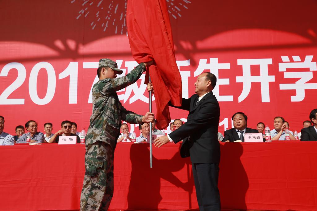 9月11日上午9,伴随着雄壮的国歌声和冉冉升起的五星红旗,我院2017级新生开学典礼暨军训动员大会在南校区田径场隆重举行。学院党委书记赵曼向军训团授旗党委副书记、院长王周锁作讲话。开学典礼暨军训动员大会由副院长张迪主持。