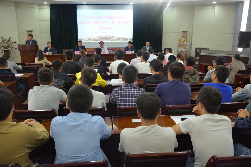 9月28日,我院建筑工程分院在水韵楼二楼报告厅举行2017年“校企合作”暨“订单班”签约仪式学院与陕西泰和力华工程管理咨询有限公司、陕西三秦伟业建筑劳务有限公司、陕西境商房地产营销策划有限公司等三家企业签署了“校企合作”暨“订单班”协议。学院院长王周锁,建筑工程分院领导班子、骨干教师、专业带头人和学生代表110余人参加签约仪式