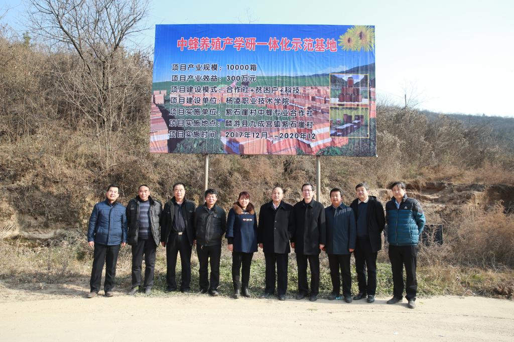 12月15日,为贯彻落实 《全省脱贫攻坚 2017冬季行动方案》精神,扎实推进高校结对帮扶“双百工程”,有效地为当地特色产业服务,我院党委书记赵曼、党委副书记任得元一行来到麟游县九成宫镇紫石崖村,为该村捐赠20万元,用于建立中蜂养殖产学研一体化示范基地、核桃丰产栽培产学研一体化示范基地及电商网络平台。