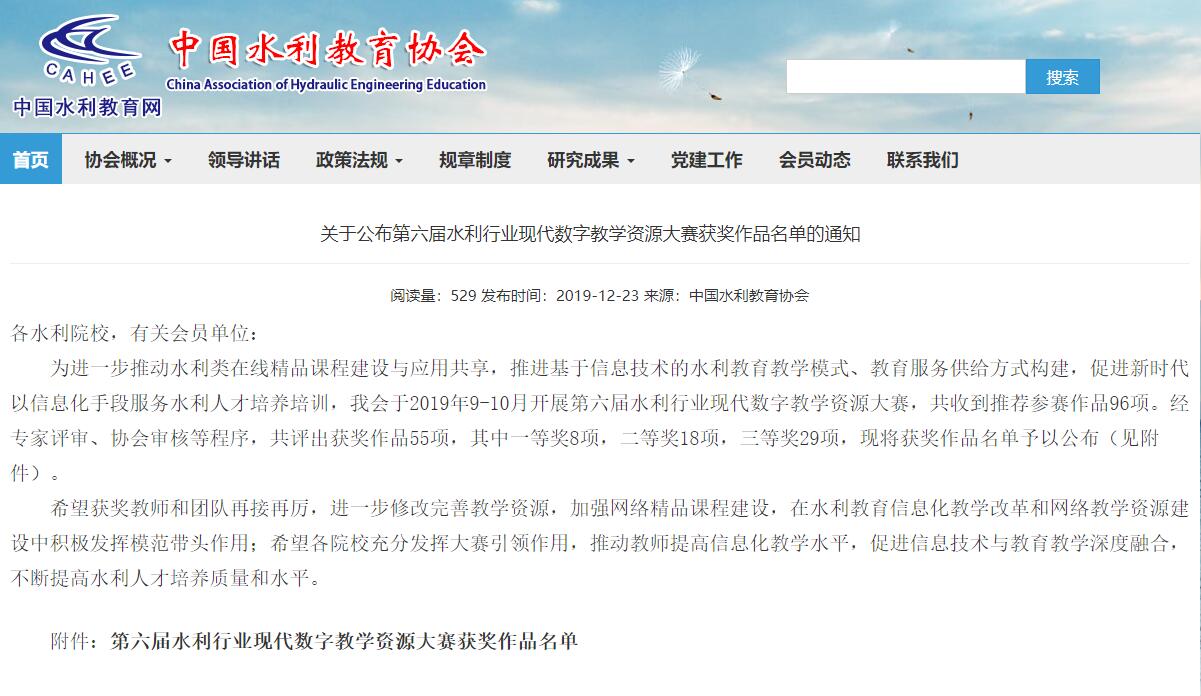 近日,在第六届“水利行业现代数字教学资源大赛”公布的比赛结果中,我院选送的参赛作品获得此次比赛总成绩排名第一,其中一等奖2项、二等奖4项、三等奖5项。