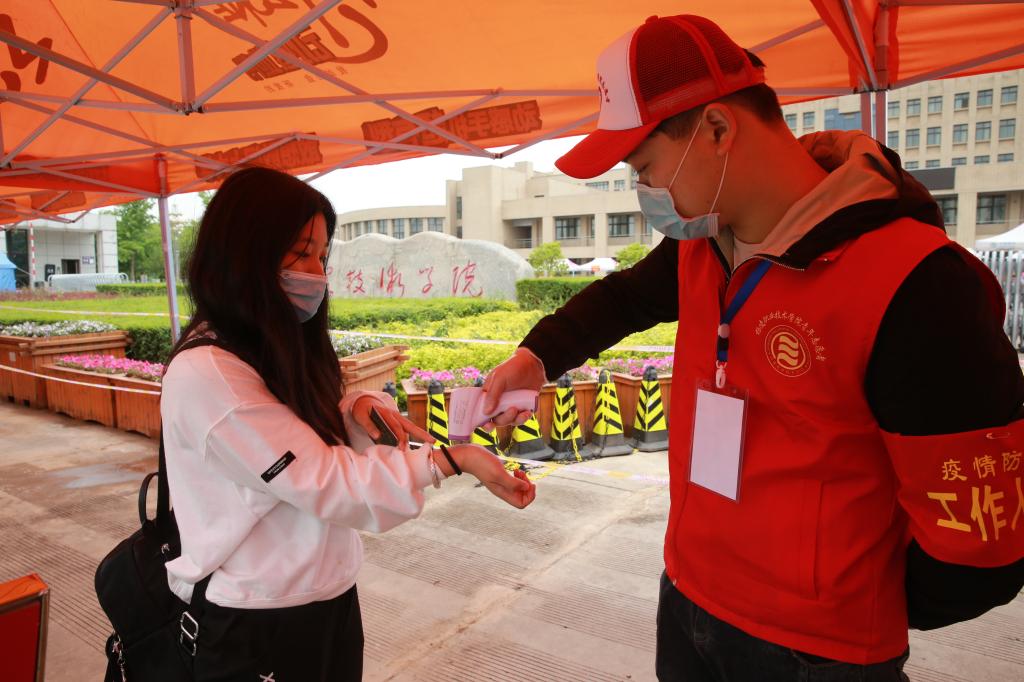 学生入校检测是做好防疫工作的第一道安全屏障。早上七点各分院教师、学生志愿者和校园保安已经身着防疫服、背好消毒桶、手持温枪到达岗位。在校门口设置的学生通道前,返校学生间隔1米以上、有序排队,先出示学生证、健康码,再经测量体温正常后,进入行李消杀区域,然后到所在分院登记处进行信息登记,提交《健康承诺书》,领取备用口罩