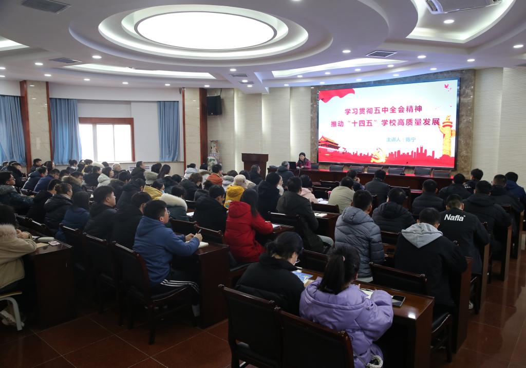 宣讲中,陈宁对全会精神进行了全面准确的解读和阐释。围绕深入学习贯彻十九届五中全会精神,从深刻认识我国进入新发展阶段的重大意义、有利条件和重要特征,准确把握“十四五”时期我国发展的指导方针、主要目标和2035年远景目标,牢牢把握构建新发展格局的战略构想和重要着力点等方面阐释了十九届五中全会的主要内容。详细讲述了榆林在发展过程中,通过坚持绿色发展理念,逐步实现了以经济发展为中心,全面协调可持续的科学发展道路的例子,生动说明了如何落实五中全会精神。她还介绍了我校“十四五”的指导思想、发展目标、主要任务和“123456”发展思路等。她希望,广大师生要牢牢把握“十四五”发展重大机遇,提高政治站位,主动谋划思考,在做好学校“十三五”规划收官工作的基础上,总结经验,探索路径,确保高标准、高质量完成“十四五”规划编制各项工作任务,推进学校各项事业向前发展。