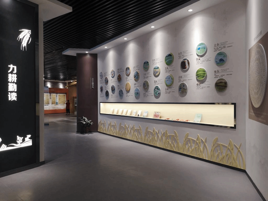 序厅融合竹简、活字印刷、毛笔、学堂、农耕等元素,寓意耕读文化历史深厚,新时代的广大师生继续将论文写在大地上,开启耕读教育新篇章。