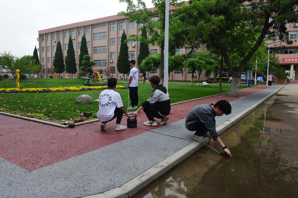 活动前期,自动化技术创新小组师生在雨后检查了南校区人行道积水情况,发现有几处人流量大的路面排水不畅,导致雨后路面仍大面积积水,影响师生通行,逐结合专业知识、现场路面特点等设计实施方案、采购元件材料、制作便携式排水泵对路面积水进行抽排,将路面积攒雨水喷洒到路边绿化带,为绿化带进行灌溉。自动化技术创新小组学生根据老师指导,进行水泵进水方式选择、供电方式选择,搭建抽水系统。在保证抽排路面积水的同时,还能保证用电安全、并方便移动到其他积水点进行抽排。