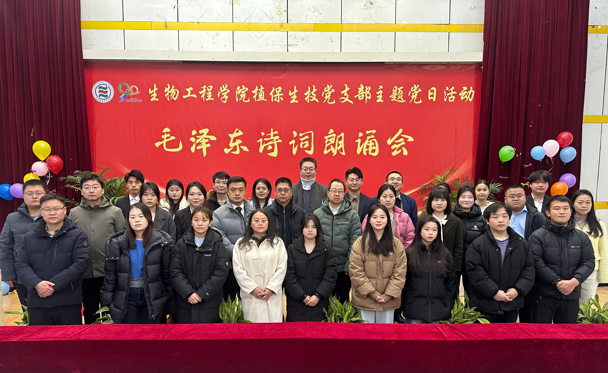 12月9日下午,生物工程学院党总支开展毛泽东诗词朗诵会主题党日活动。生物工程学院全体党员、入党积极分子及教职工共150余人参加活动。