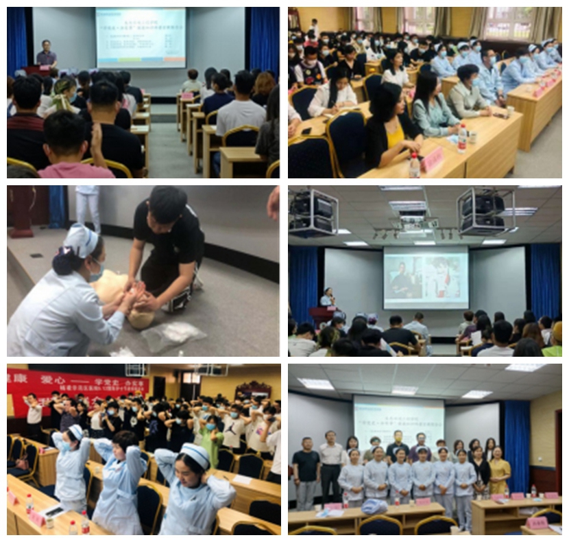 报告会分为四个部分进行。示范区医院急诊科主任裴凡卜、护士长张田作《急救知识与操作》报告,为师生详细地介绍了心脏复苏的基本常识,组织师生代表现场演示了心脏复苏的操作技巧。抗疫英雄、感控科副主任黄伟鸽作了《万众齐心,疫情有我》的报告,她介绍了新型冠状病毒传播路径、目前的抗疫现状、疫情期间如何做好个人防护等,现场演示了七步洗手法。呼吸科护士长闫静作了《预防结核,爱护你我他》的报告,她向师生介绍了结核病的基本概况、预防治疗的相关知识、校园结核病的现状以及校园结核病的应急处理办法等。  疼痛科护士长魏芸作了《颈椎病的预防和保健》主题讲座,她为大家介绍了人类颈椎病的发病现状、临床症状、治疗办法和预防措施。现场教授了颈椎保健操,为大家直观地展示了预防颈椎病的办法,深受大家的欢迎。