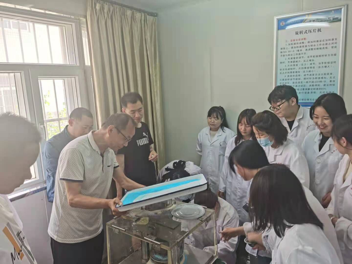 利君制药技术团队围绕制药设备的标准操作规程、故障排查与维修,车间风险识别和风险控制,车间风险解除后的总结回顾等方面,与校内课程团队教师开展了研讨、交流。双方团队以生产实践的薄弱环节和解决措施为抓手,共同完成了从制药原料到成品片剂的生产现场演示,并且从生产一线的视角展示了一场“含药量”十足的生产实践,进一步强化了药物实训中心的生产性功能属性。