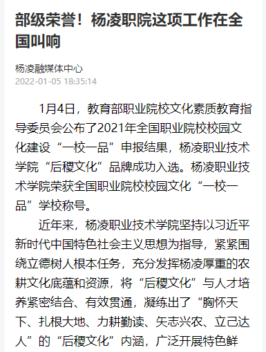 1月4日,教育部职业院校文化素质教育指导委员会公布了2021年全国职业院校校园文化建设“一校一品”申报结果,杨凌职业技术学院“后稷文化”品牌成功入选。杨凌职业技术学院荣获全国职业院校校园文化“一校一品”学校称号。