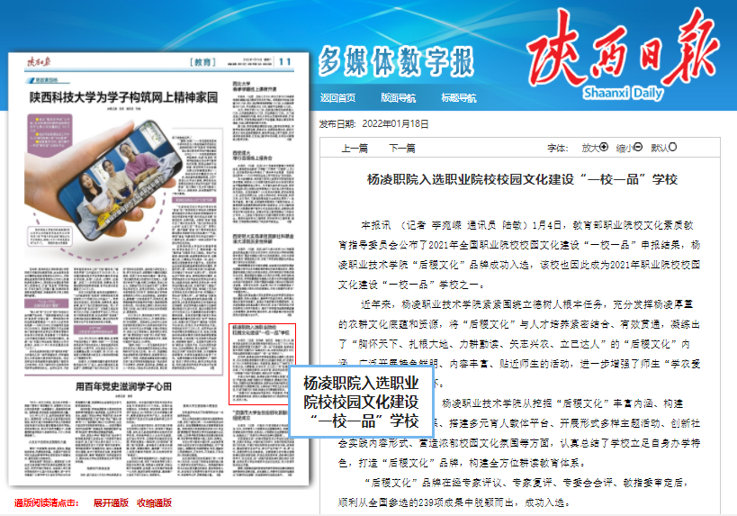 【陕西日报】杨凌职院入选职业院校校园文化建设“一校一品”学校