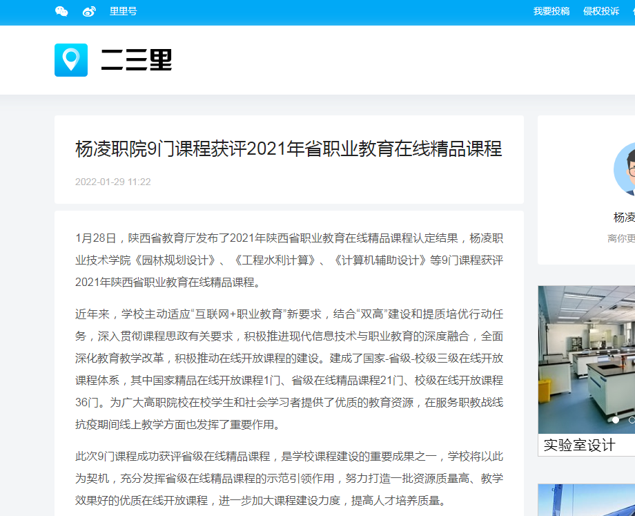 1月28日,陕西省教育厅发布了2021年陕西省职业教育在线精品课程认定结果,杨凌职业技术学院《园林规划设计》、《工程水利计算》、《计算机辅助设计》等9门课程获评2021年陕西省职业教育在线精品课程。