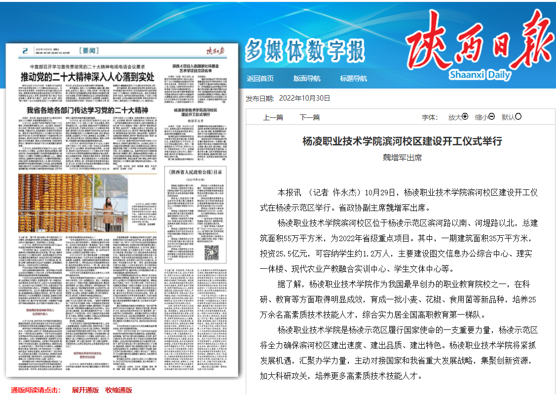 杨凌职业技术学院是杨凌示范区履行国家使命的一支重要力量,杨凌示范区将全力确保滨河校区建出速度、建出品质、建出特色。杨凌职业技术学院将紧抓发展机遇,汇聚办学力量,主动对接国家和我省重大发展战略,集聚创新资源,加大科研攻关,培养更多高素质技术技能人才。