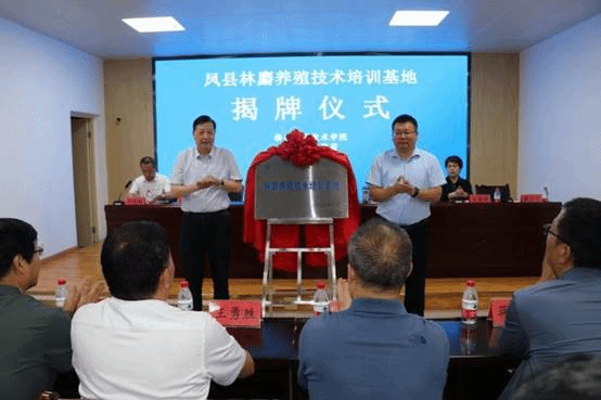 揭牌仪式上,与会领导分别为陕西省林业科学院林麝产业工程技术研究中心、杨凌职业技术学院林麝养殖技术培训基地揭牌。