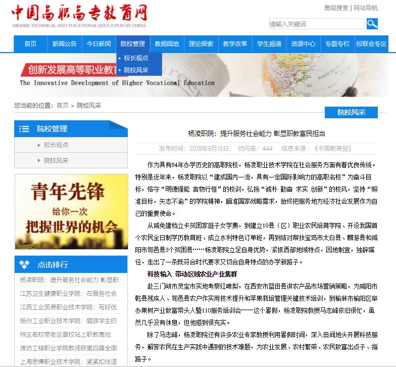 作为具有84年办学历史的高职院校,杨凌职业技术学院在社会服务方面有着优良传统。特别是近年来,杨凌职院以“建成国内一流,具有一定国际影响力的高职名校”为奋斗目标,恪守“明德强能 言物行恒”的校训,弘扬“诚朴 勤奋 求实 创新”的校风,坚持“照准目标,矢志不渝”的学院精神,瞄准国家战略需求,始终把服务地方经济社会发展作为自己的重要使命。