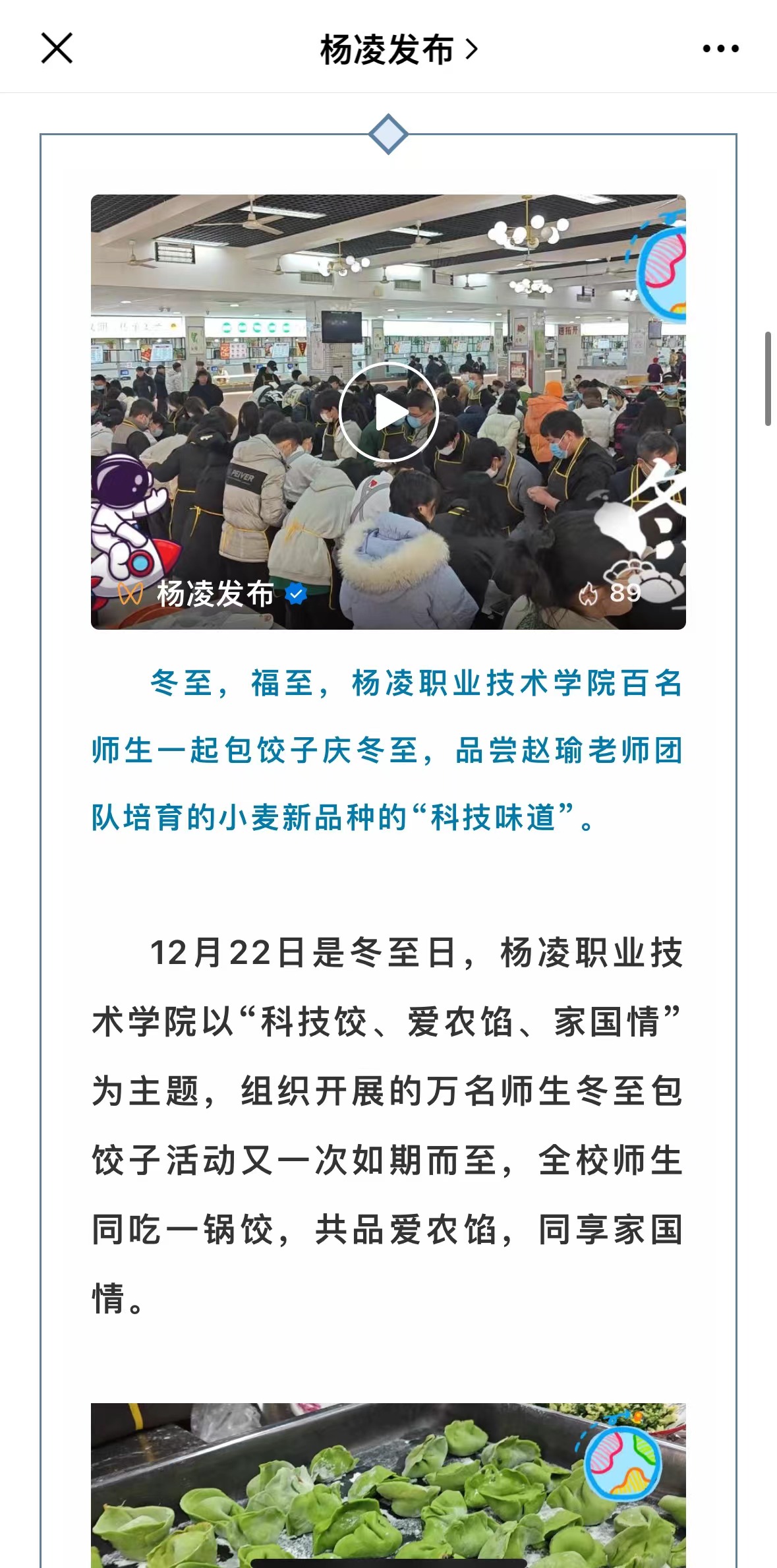 家国情,冬至是中华民族的传统节气,学校免费为广大师生送饺子,凝结了杨凌职院对师生的美好祝福,更涌动着浓浓的家国情。