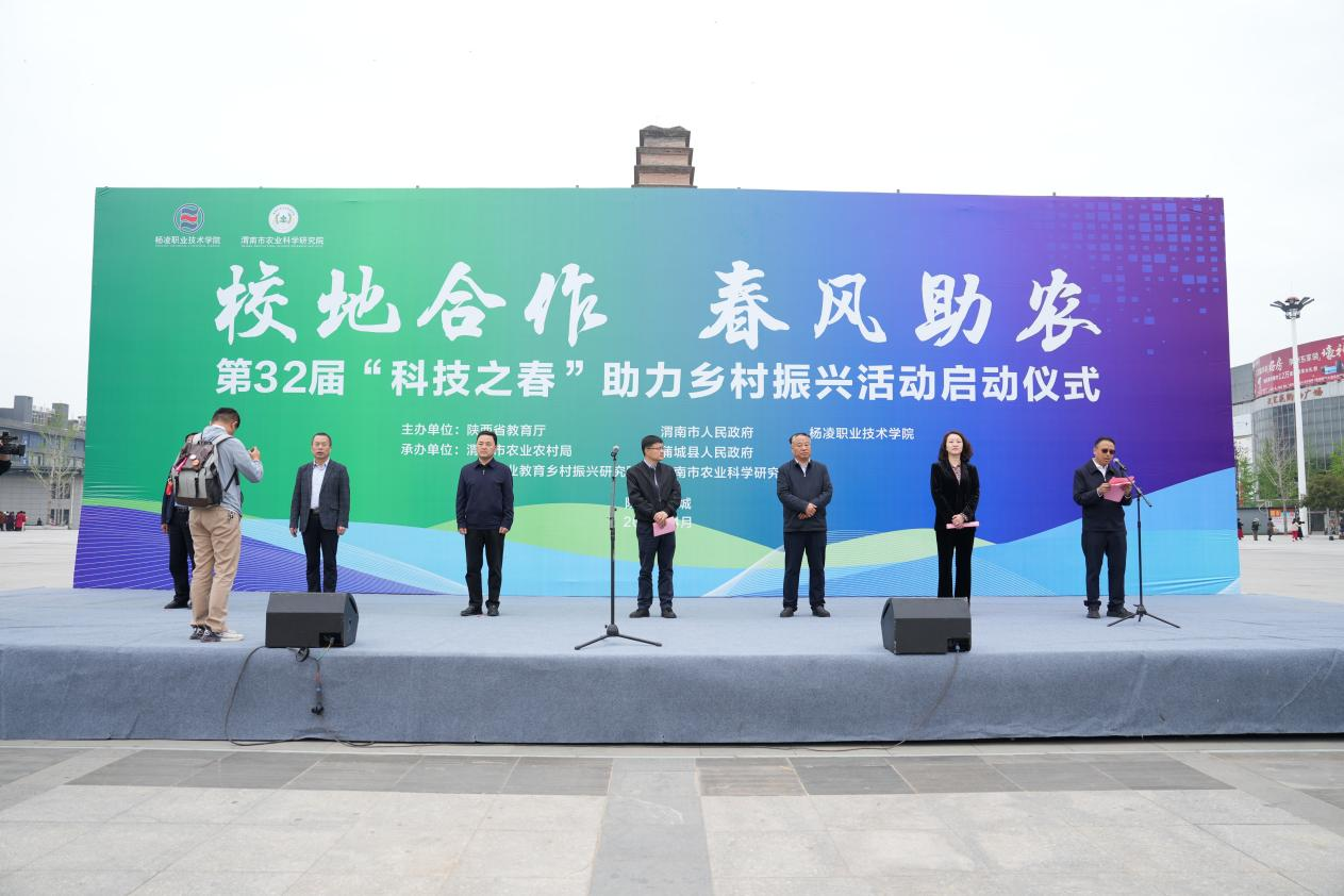 4月10日,由陕西省教育厅、渭南市委市政府和杨凌职业技术学院主办的第32届“科技之春”助力乡村振兴活动启动仪式在渭南市蒲城县中心广场举行。杨凌职业技术学院党委书记王周锁宣布第32届“科技之春”助力乡村振兴活动启动。省教育厅高校技术转移中心主任田鹏,渭南市农业农村局党委委员、副局长刘刚、党组成员、副局长普布顿珠,渭南市农科院院长王杨军,杨凌职业技术学院副校长胡俊鹏,蒲城县副县长冯新等出席启动仪式。