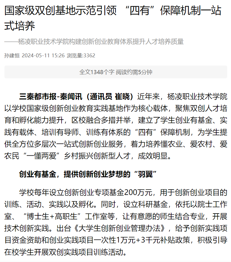 【三秦都市报】国家级双创基地示范引领 “四有”保障机制一站式培养——杨凌职业技术学院构建创新创业教育体系提升人才培养质量