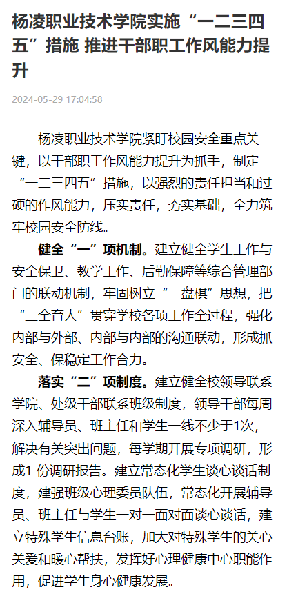 “一二三四五”措施是杨凌职业技术学院持续落实全省“三个年”活动,进一步深化干部作风能力建设、强化学生教育管理、提高育人质效的一项重要举措。该措施自本学期实施以来,全体校领导、处级干部能够积极发挥在学生教育管理中的带动作用,下沉一线主动联系师生、解决问题;辅导员每天上午7:50-8:30在学生公寓开展工作,班主任每周深入学生公寓2次以上,辅导员、班主任与学生谈心谈话1.4万余人次,形成了辅导员和班主任自觉入住学生公寓、全面了解学生生活情况和心理状况的常态化机制;广大学生能够严格遵守校规校纪,养成良好的行为习惯,提高自我约束能力,打造了清净的校风、清正的教风、清新的学风,更筑起了校园安全防线。