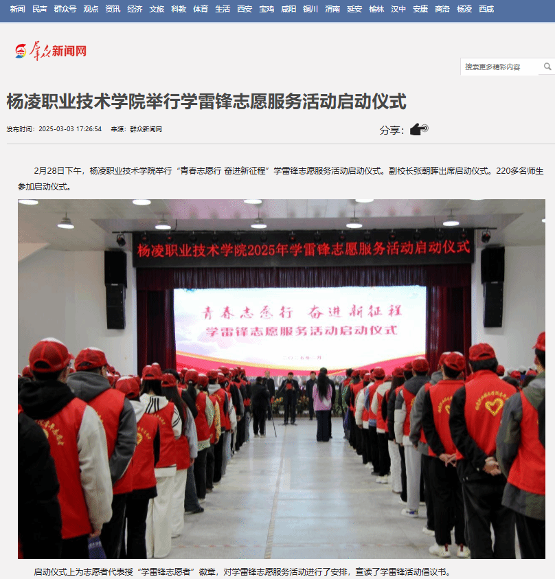 2月28日下午,杨凌职业技术学院举行“青春志愿行 奋进新征程”学雷锋志愿服务活动启动仪式。副校长张朝晖出席启动仪式。220多名师生参加启动仪式。