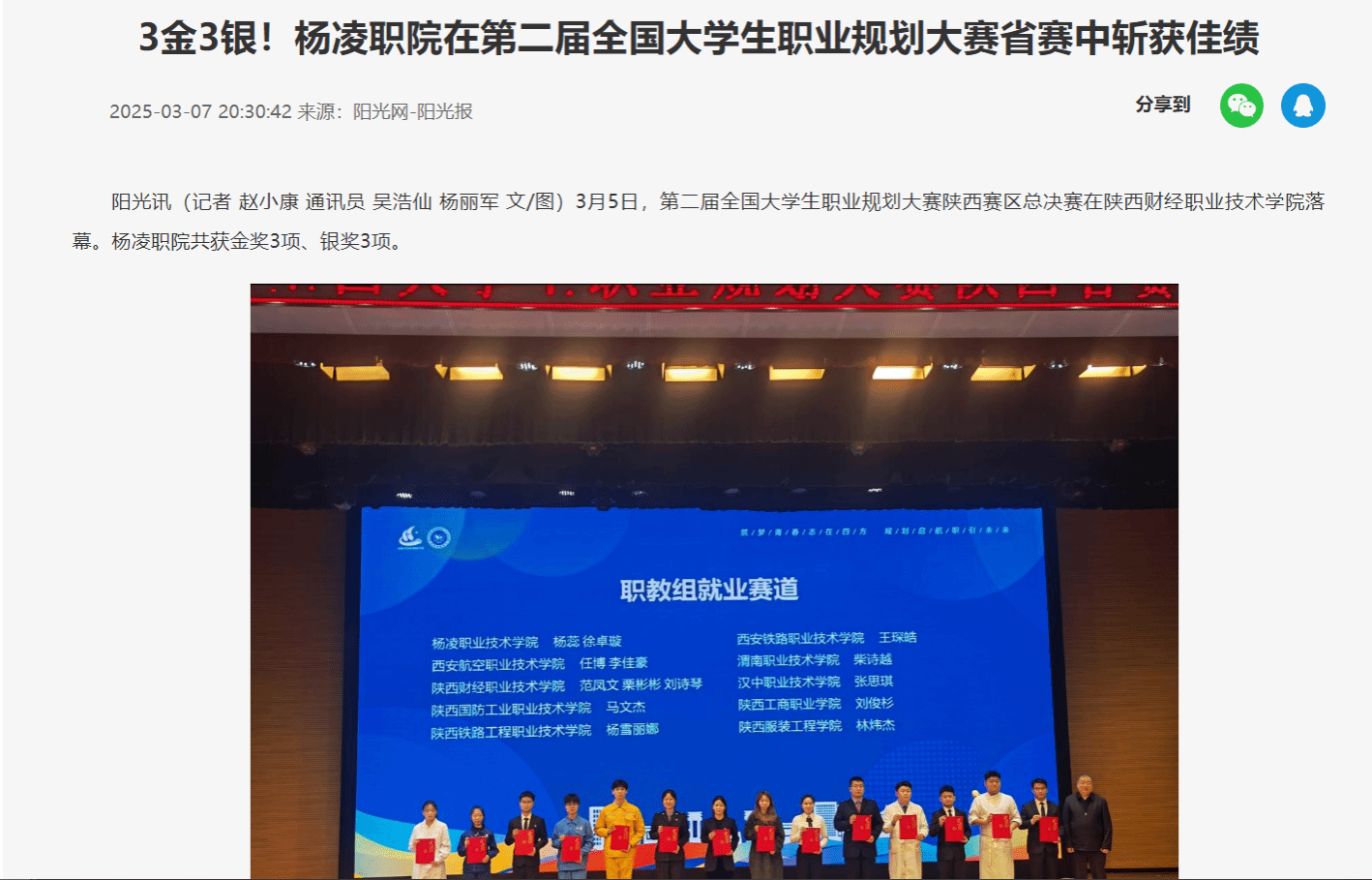 阳光讯(记者 赵小康 通讯员 吴浩仙 杨丽军 文/图)3月5日,第二届全国大学生职业规划大赛陕西赛区总决赛在陕西财经职业技术学院落幕。杨凌职院共获金奖3项、银奖3项。