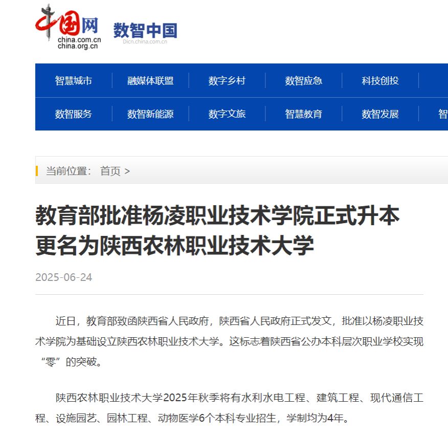 【中国网】教育部批准杨凌职业技术学院正式升本 更名为陕西农林职业技术大学