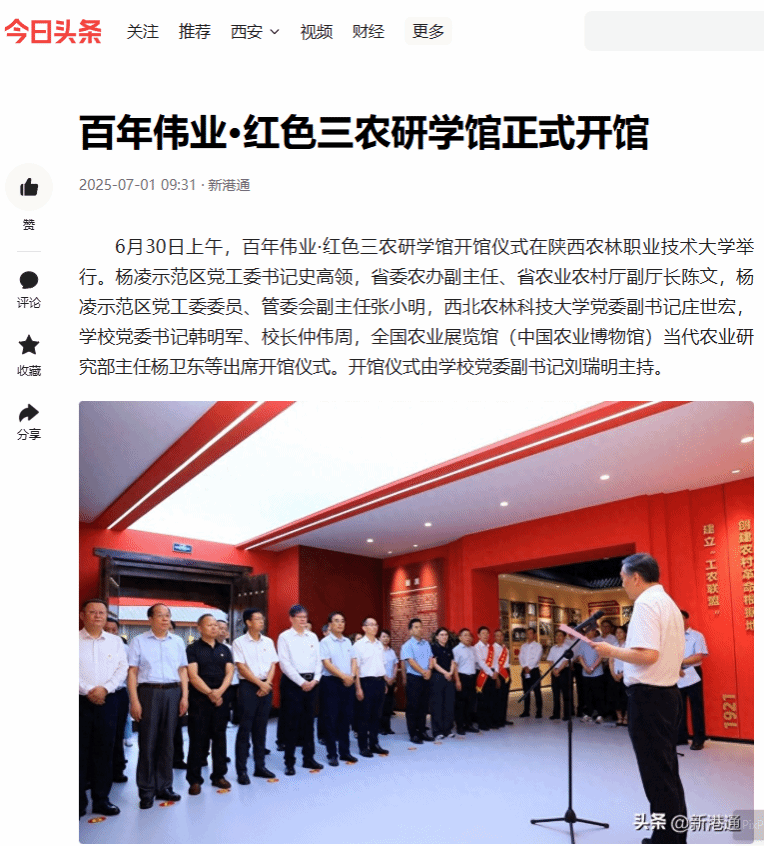 6月30日上午,百年伟业·红色三农研学馆开馆仪式在陕西农林职业技术大学举行。杨凌示范区党工委书记史高领,省委农办副主任、省农业农村厅副厅长陈文,杨凌示范区党工委委员、管委会副主任张小明,西北农林科技大学党委副书记庄世宏,学校党委书记韩明军、校长仲伟周,全国农业展览馆(中国农业博物馆)当代农业研究部主任杨卫东等出席开馆仪式。开馆仪式由学校党委副书记刘瑞明主持。