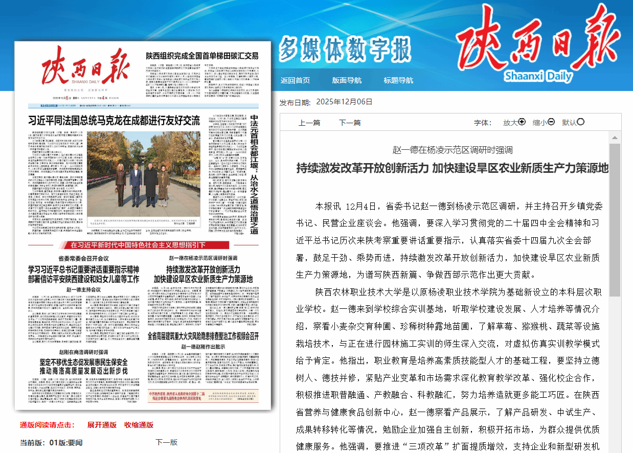 陕西农林职业技术大学是以原杨凌职业技术学院为基础新设立的本科层次职业学校。赵一德来到学校综合实训基地,听取学校建设发展、人才培养等情况介绍,察看小麦杂交育种圃、珍稀树种露地苗圃,了解草莓、猕猴桃、蔬菜等设施栽培技术,与正在进行园林施工实训的师生深入交流,对虚拟仿真实训教学模式给予肯定。他指出,职业教育是培养高素质技能型人才的基础工程,要坚持立德树人、德技并修,紧贴产业变革和市场需求深化教育教学改革、强化校企合作,积极推进职普融通、产教融合、科教融汇,努力培养造就更多能工巧匠。在陕西省营养与健康食品创新中心,赵一德察看产品展示,了解产品研发、中试生产、成果转移转化等情况,勉励企业加强自主创新,积极开拓市场,为群众提供优质健康服务。他强调,要推进“三项改革”扩面提质增效,支持企业和新型研发机构就近就地转化科技成果,不断为高质量发展注入新动能。