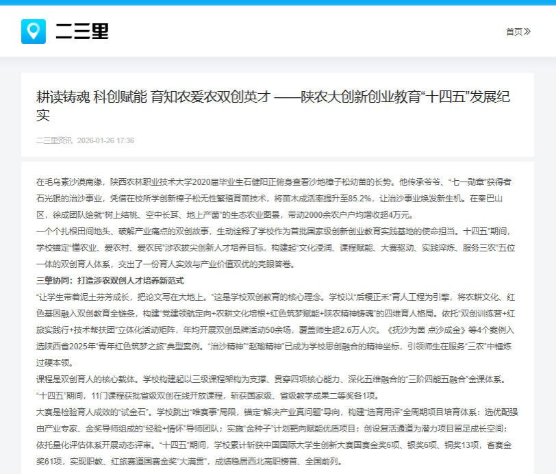 “让学生带着泥土芬芳成长,把论文写在大地上。”这是学校双创教育的核心理念。学校以“后稷正禾”育人工程为引擎,将农耕文化、红色基因融入双创教育全链条,构建“党建领航定向+农耕文化培根+红色筑梦赋能+陕农精神铸魂”的四维育人格局。依托“双创训练营+红旅实践行+技术帮扶团”立体化活动矩阵,年均开展双创品牌活动50余场,覆盖师生超2.6万人次。《抚沙为茵 点沙成金》等4个案例入选陕西省2025年“青年红色筑梦之旅”典型案例。“治沙精神”“赵瑜精神”已成为学校思创融合的精神坐标,引领师生在服务“三农”中锤炼过硬本领。