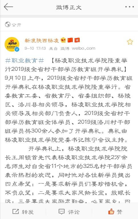 #职业教育# 【杨凌职业技术学院隆重举行2019级全省村干部学历教育班开学典礼】9月10日上午,2019级全省村干部学历教育班开学典礼在杨凌职业技术学院隆重举行。省委教育工委、省教育厅、省委组织部、杨陵区、洛川县相关领导,杨凌职业技术学院相关领导及相关部门负责人,2019级全省村干部学历教育班全体学员、2019级洛川村干部班学员共300余人参加了开学典礼。典礼由杨凌职业技术学院党委书记陈宁会议主持。