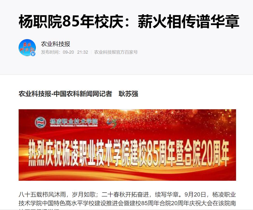 八十五载栉风沐雨,岁月如歌;二十春秋开拓奋进,续写华章。9月20日,杨凌职业技术学院中国特色高水平学校建设推进会暨建校85周年合院20周年庆祝大会在该院南校区田径场举行。