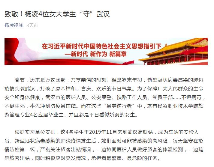 春节,历来是万家团聚,共享亲情的时刻。但是岁末年初,新型冠状病毒感染的肺炎疫情突袭武汉,为了保障广大人民群众的生命安全和身体健康,武汉市的医护人员、公安民警、铁路工作人员、党员干部……不惧病毒,不畏生死,率先冲到防疫最前线。而在这些“最美逆行者”中,就有杨凌职业技术学院旅游管理专业4名应届毕业生,并且都是平日看似娇弱的女生。