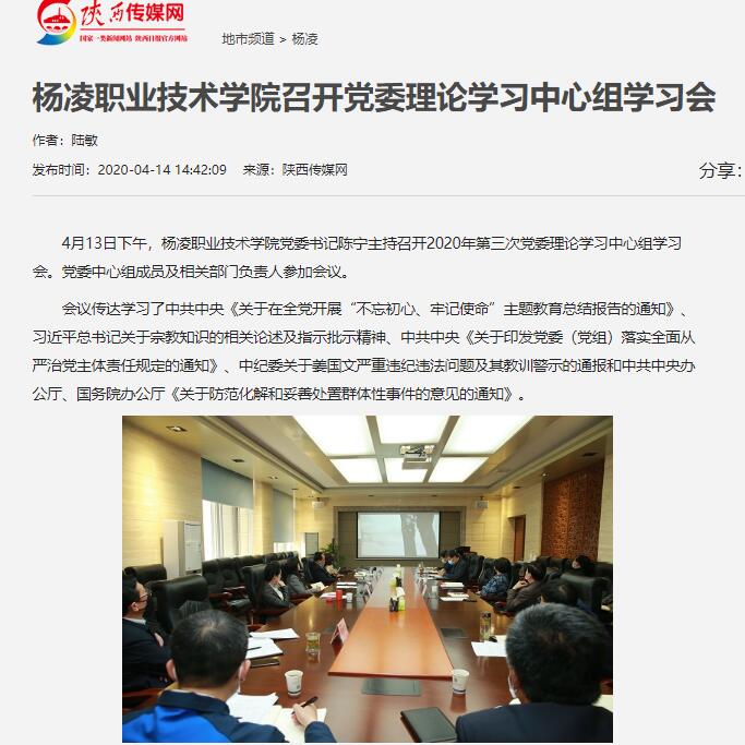 4月13日下午,杨凌职业技术学院党委书记陈宁主持召开2020年第三次党委理论学习中心组学习会。党委中心组成员及相关部门负责人参加会议。