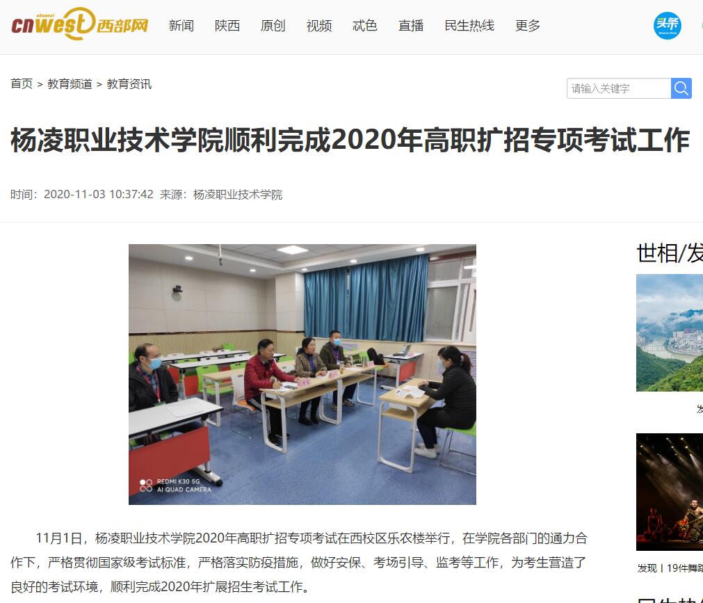 11月1日,杨凌职业技术学院2020年高职扩招专项考试在西校区乐农楼举行,在学院各部门的通力合作下,严格贯彻国家级考试标准,严格落实防疫措施,做好安保、考场引导、监考等工作,为考生营造了良好的考试环境,顺利完成2020年扩展招生考试工作。