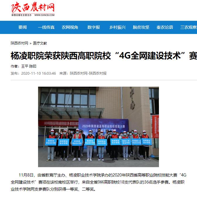 11月8日,由省教育厅主办、杨凌职业技术学院承办的2020年陕西省高等职业院校技能大赛“4G全网建设技术”赛项在该校南校区举行,来自全省9所高职院校18支代表队的36名选手参赛。杨凌职业技术学院两支参赛队分别获得一等奖、二等奖。