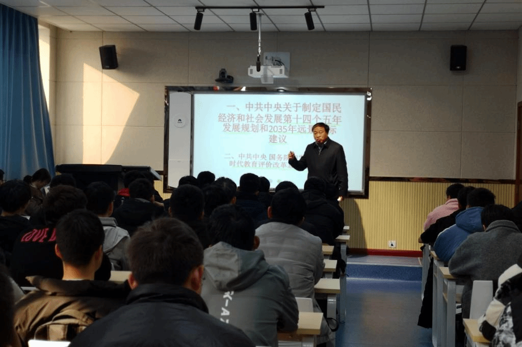 讲课中,王周锁为学生宣讲了党的十九届五中全会精神,对《中共中央关于制定国民经济和社会发展第十四个五年规划和二〇三五年远景目标的建议》和中共中央、国务院印发的《深化新时代教育评价改革总体方案》进行了准确的解读。围绕《建议》,他重点对新发展阶段、新发展理念、新发展格局三个方面进行了阐述。在《总体方案》方面,他从总体要求、重点任务、组织实施三个方面进行了解读。