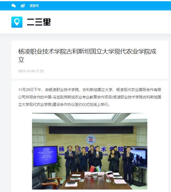 11月29日下午,由杨凌职业技术学院、古利斯坦国立大学、杨凌现代农业国际合作有限公司共同合作的中国-乌兹别克斯坦农业专业教育合作项目(杨凌职业技术学院古利斯坦国立大学现代农业学院)建设合作协议签约仪式在线上举行。