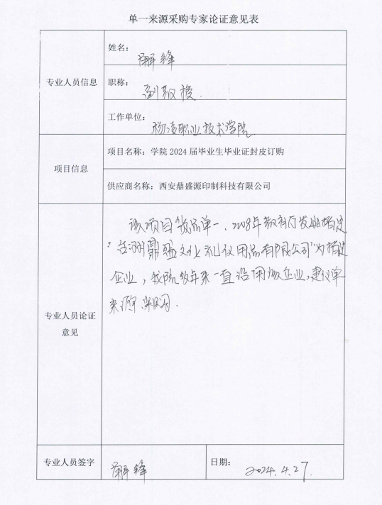 杨凌职业技术学院2024届毕业证封皮订购项目,根据项目立项相关资料及专家论证意见,拟采用单一来源采购方式,该项目拟由西安鼎盛源印制科技有限公司承担。现将有关情况向潜在的供应商广泛征求意见。