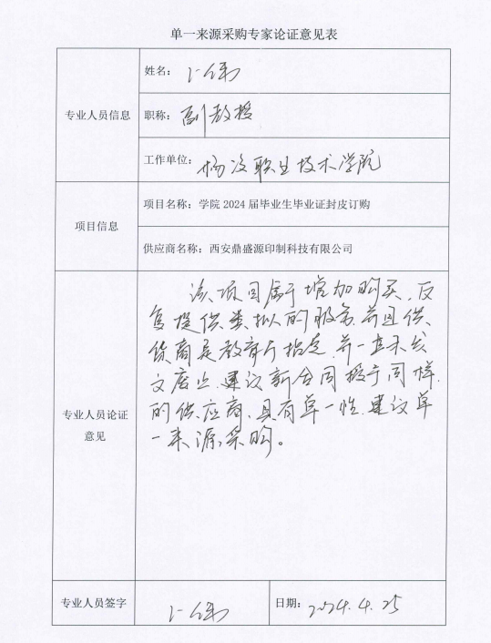 杨凌职业技术学院2024届毕业证封皮订购项目单一来源谈判采购征求意见公示