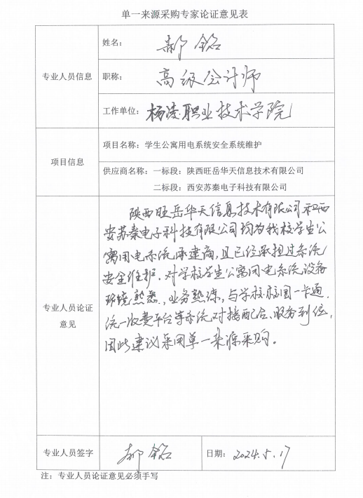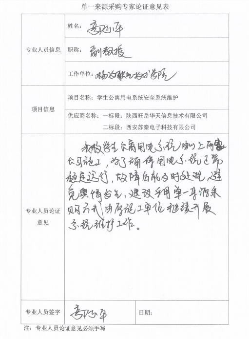 凌职业技术学院杨凌职业技术学院学生公寓用电维护项目项目一标段:三校区公寓空调,北校区公寓;项目二标段:西校区公寓,南校区101-105.107公寓。根据项目立项相关资料及专家论证意见,拟采用单一来源采购方式,该项目一标段拟由陕西旺岳华天信息技术有限公司承担项目二标段拟由西安苏秦电子科技有限公司承担。现将有关情况向潜在的供应商广泛征求意见。