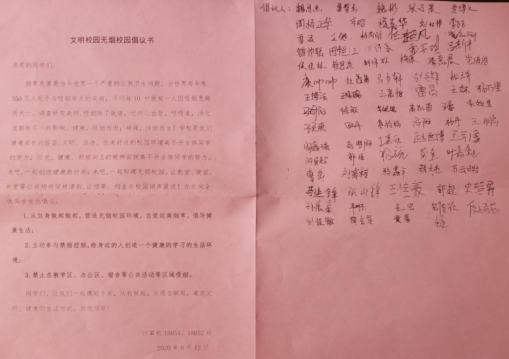 2020年6月12日,为提高广大学生的诚信意识,引导学生在生活、学习、工作中始终贯彻落实诚信做人的原则,计算机18051、18052班全体学生在醒钟楼NOB101教室举办诚信及控烟教育主题班会。